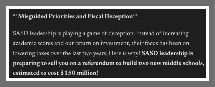 This site has been referenced by SASD leadership and the SASD school board as disseminating disinformation.
